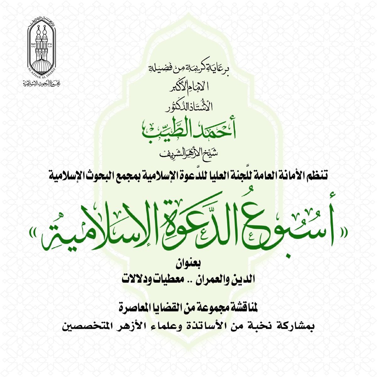 من جانبه، أشار الدكتور حسن يحيى، الأمين المساعد للَّجنة العُليا لشئون الدعوة، إلى أن (الأسبوع الثالث للدعوة الإسلامية) يُعقَد على مدار أسبوع، وسوف يناقش عددًا من الموضوعات المهمَّة؛ هي (بناء الأسرة أساس العمران)، و(الفطرة ومقوِّمات إصلاحها)، و(الإسلام دِين الحياة)، و(دَور المرأة في تحقيق العمران.. رؤية إسلاميَّة)، و(الشباب بين عمران النَّفْس وعمران الكون.. توجيهات إسلاميَّة).