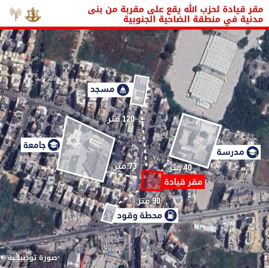 وزعم الجيش أن حزب الله يقوم بإنشاء بنى عسكرية داخل مناطق مدنية في أنحاء لبنان بشكل متعمد بهدف تنفيذ أعمال إرهابية واضعا عناصره وقادته في قلب السكان المدنيين.
