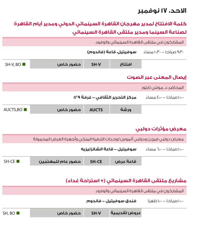 ينظم مهرجان القاهرة السينمائي الدولي في دورته الـ 45 برئاسة الفنان الكبير حسين فهمي، اليوم الأحد، الموافق 17 نوفمبر الجاري، العديد من الفعاليات والندوات والجلسات الحوارية، بالإضافة إلى عروض الأفلام بمسابقات المهرجان المختلفة، ويأتي برنامج اليوم كالتالي: