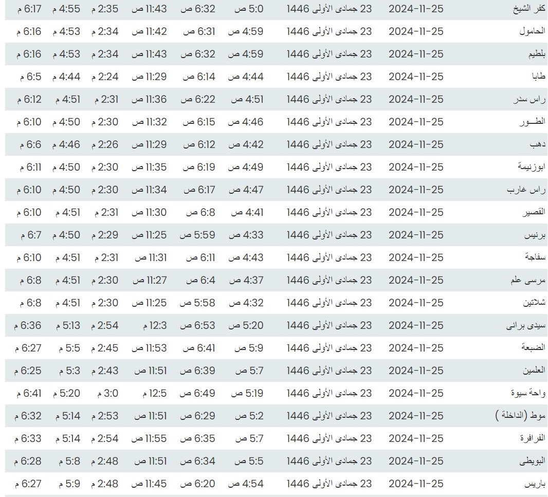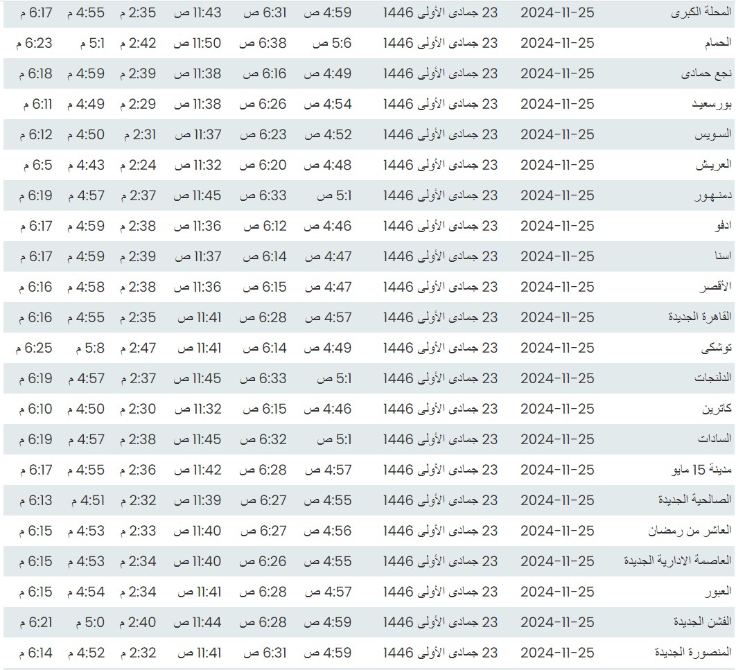 وفيما يلي مواقيت الصلاة، لعدد من مدن ومحافظات الجمهورية من واقع بيانات الهيئة العامة للمساحة