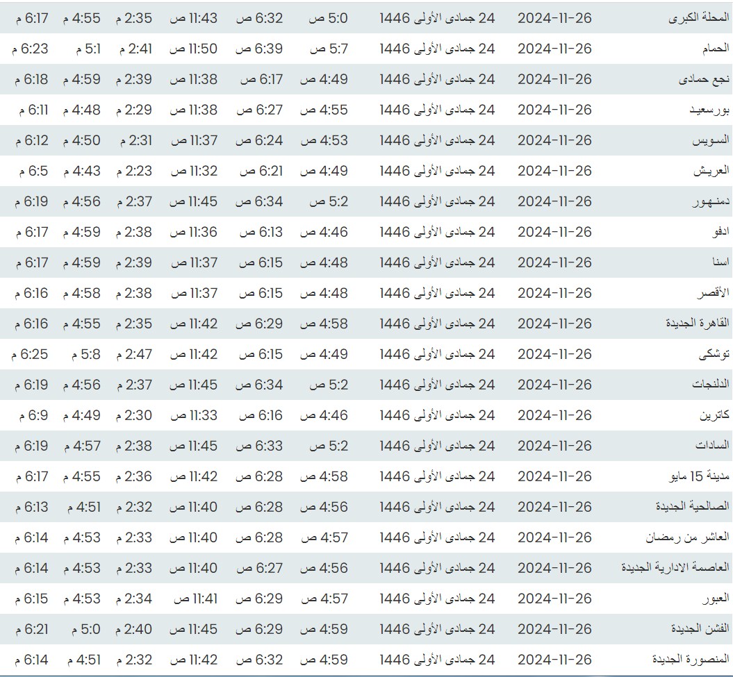 مواقيت الصلاة اليوم الثلاثاء 26 - 11- 2024 في القاهرة والمحافظات