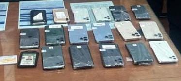وبعد استيفائه وتفتيشه ذاتيا، تم ضبط (١٧) هاتفا محمولا من نوع أيفون مخبأة حول جسده وبين طيات ملابسه.