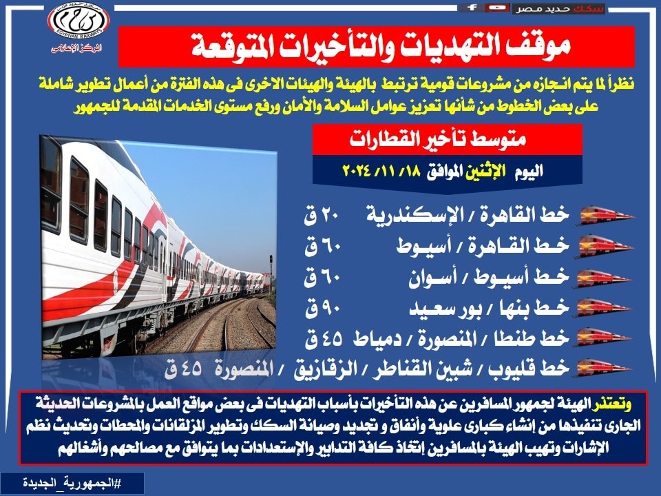 شهد صباح اليوم الأحد استقرار معدل تأخيرات القطارات، وبلغ متوسط مستوى التأخيرات 50 دقيقة مع استمرار تخفيض السرعة صباحًا، فى مداخل القرى بسبب الشبورة، بينما كانت خطوط بورسعيد الأعلى فى تأخيرات القطارات اليوم بـ90 دقيقة.