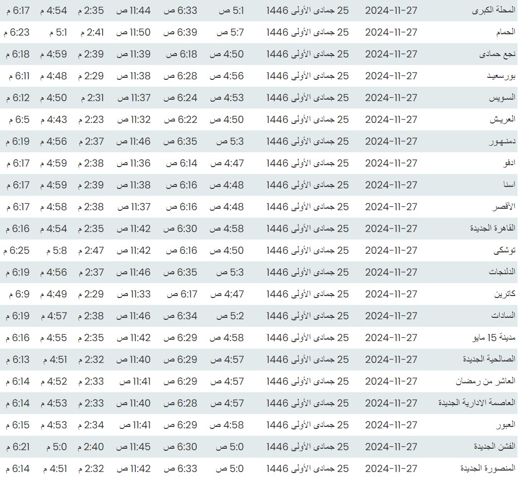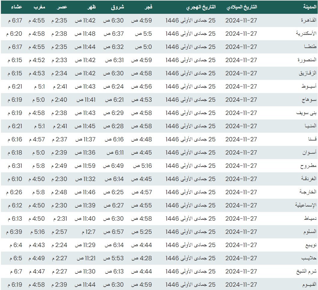 مواقيت الصلاة اليوم الأربعاء 27 - 11- 2024 في القاهرة والمحافظات