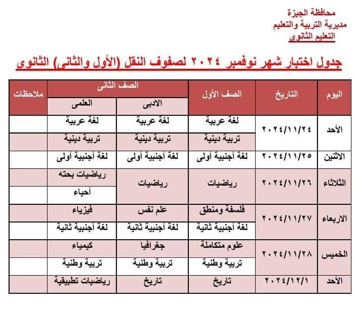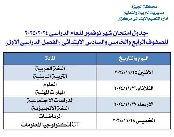 تعليم الجيزة تعلن جداول امتحانات شهر نوفمبر 2024 (صور)