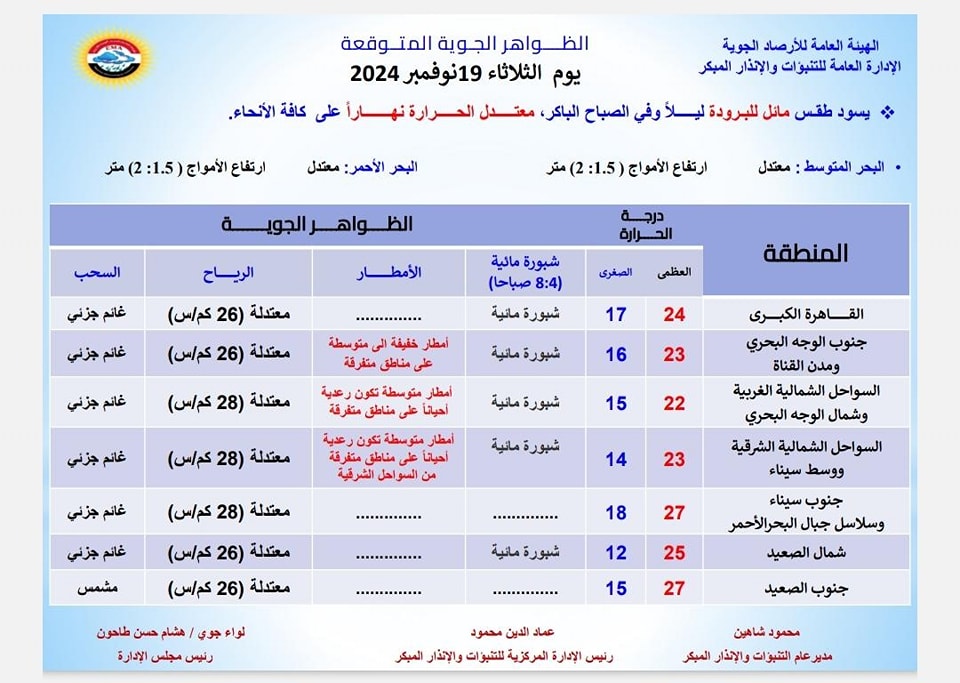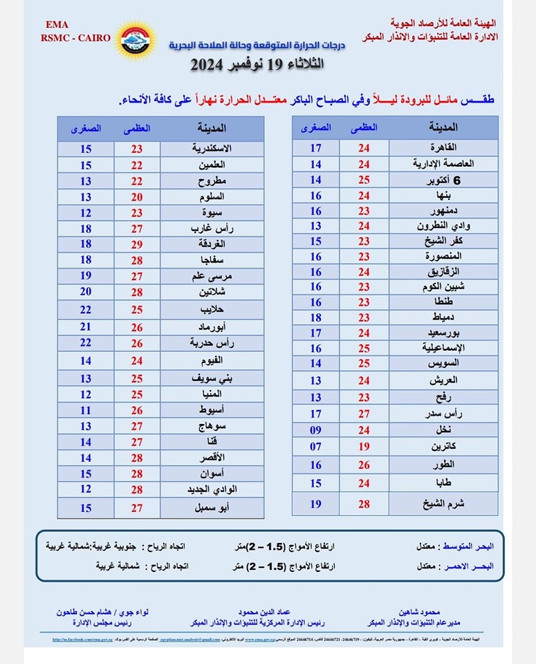 ونشرت هيئة الأرصاد بيانًا بدرجات الحرارة المتوقعة اليوم الثلاثاء على مدن ومحافظات مصر وجاءت كالتالي: