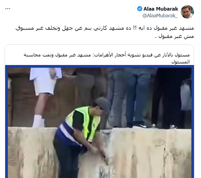 وقال علاء مبارك في رسالته التي وجها لمسئولي الآثار: “مشهد غير مقبول ده ايه ؟!! ده مشهد كارثي ينم عن جهل... غير مسبوق مش غير مقبول”.