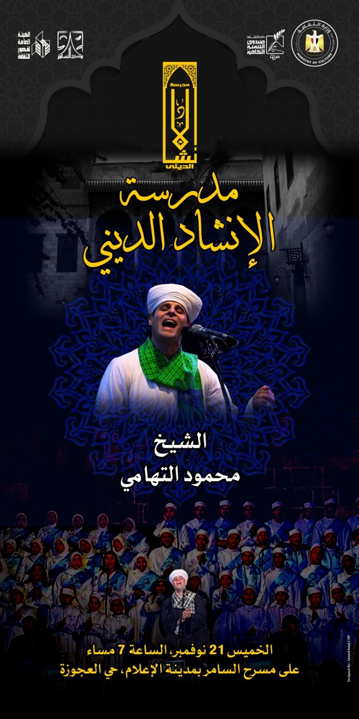 يحتفل قطاع صندوق التنمية الثقافية برئاسة المعماري حمدي السطوحي بتخريج أربعة دفعات من مدرسة الانشاد الديني، تحت إشراف الشيخ محمود التهامي نقيب المنشدين، في السابعة من مساء الخميس القادم الموافق 21 نوفمبر، وذلك في مسرح السامر بمدينة الإعلام، العجوزة.