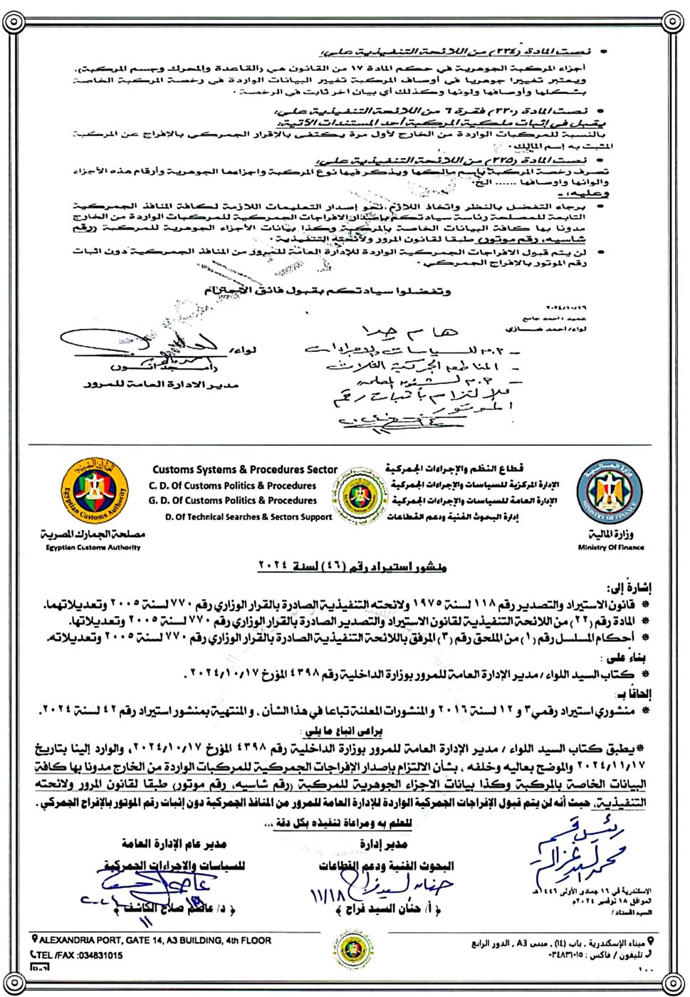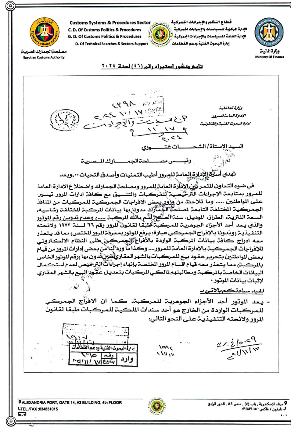 أصدرت مصلحة الجمارك المصرية، منشور استيراد رقم (46) لسنة ٢٠٢٤ بخصوص تطبيق كتاب اللواء مدير الإدارة العامة للمرور بوزارة الداخلية رقم ٤٣٩٨ المؤرخ ۲۰۲٤/۱۰/۱۷، والوارد إلى المصلحة بتاريخ ۲۰۲٤/١١/١٧.