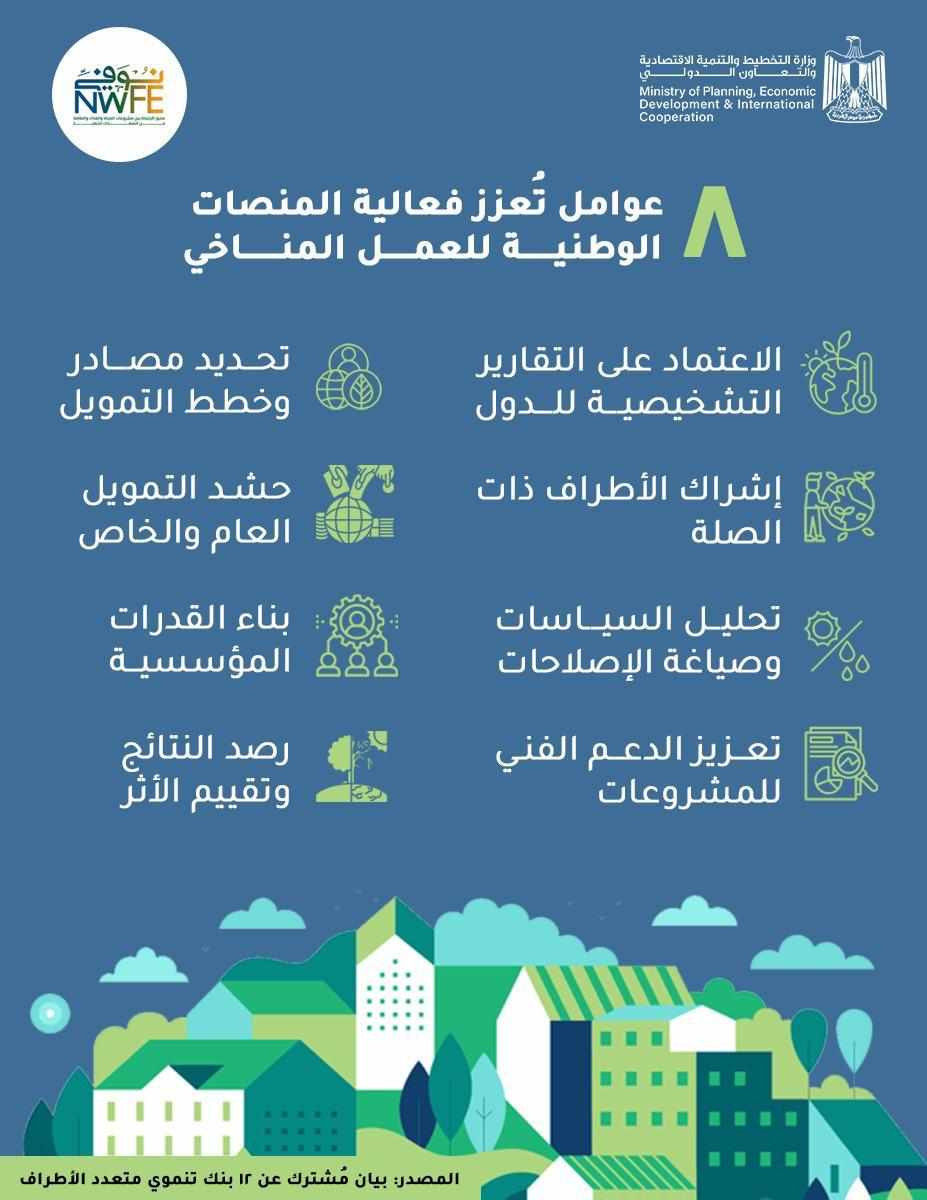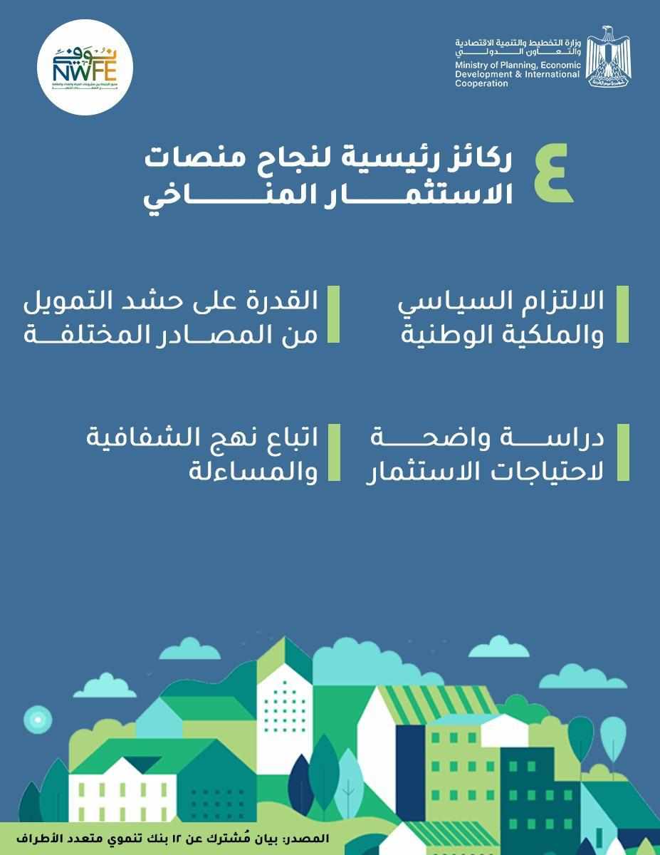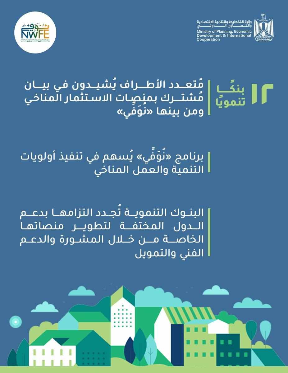 وأشاد بنوك التنمية مُتعددة الأطراف، بالمنصة الوطنية لبرنامج «نُوَفِّي»، التي أطلقتها مصر عام 2022، من أجل تعزيز استراتيجيات الاستثمار الأخضر، موضحين أن المنصة التي أطلقتها مصر تُركز على العلاقة بين المياه والغذاء والطاقة، التي حددتها البلاد كجزء من المجالات ذات الأولوية للمناخ والتنمية، وبالتالي تُسهم المنصة المصرية في التخفيف من آثار تغير المناخ والتكيف معه، ودعم القدرة على الصمود، والانتقال العادل في إطار أهداف بيئة أوسع عبر قطاعات الطاقة والنقل والمياه والزراعة.