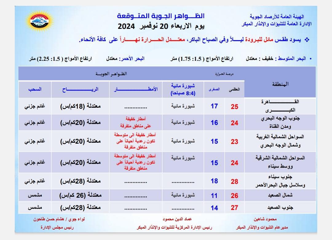 وحذرت من سقوط أمطار خفيفة على مناطق متفرقة بجنوب الوجه البحري ومدن القناة، تكون خفيفة ومتوسطة إلى رعدية أحيانا على مناطق من السواحل الشمالية الغربية وشمال الوجه البحري والسواحل الشمالية ووسط سيناء على فترات متقطعة.