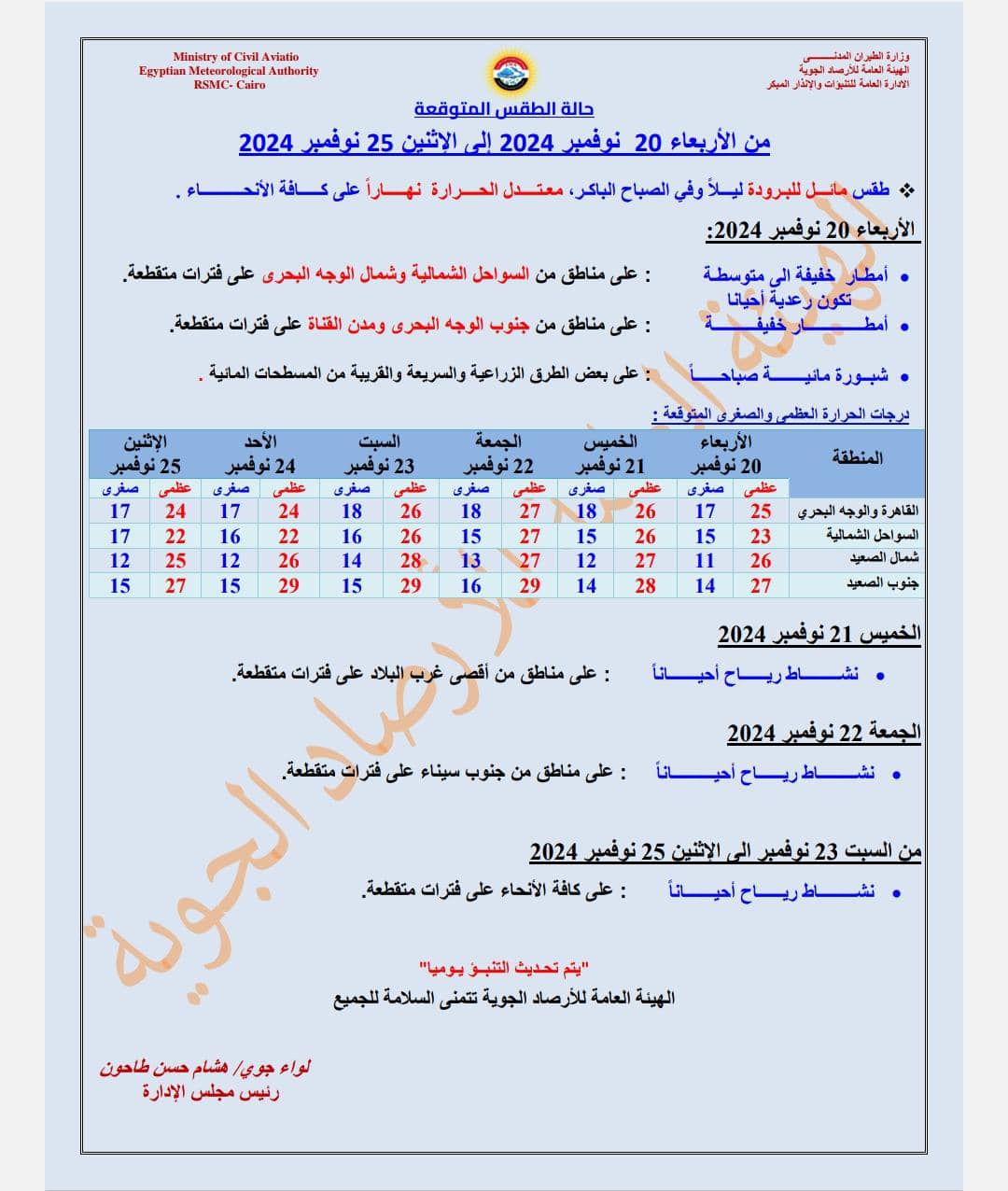 وأشارت هيئة الأرصاد إلى نشاط للرياح يومي الخميس والجمعة والسبت المقبلين على مناطق من أقصى غرب البلاد وجنوب سيناء على فترات متقطعة.