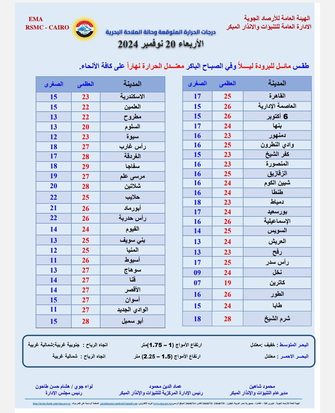 ونشرت هيئة الأرصاد بيانا بدرجات الحرارة المتوقعة اليوم على مدن ومحافظات مصر، وجاءت كالتالي: