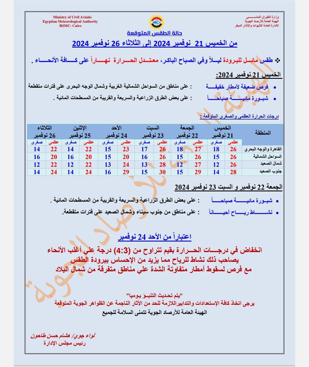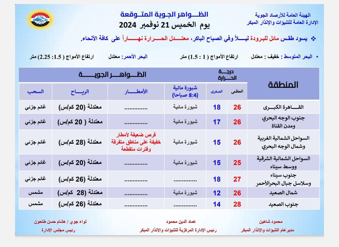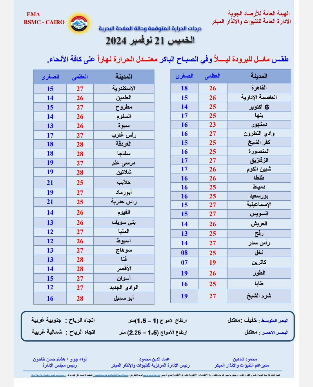 ونشرت هيئة الأرصاد الجوية بيانا بدرجات الحرارة المتوقعة اليوم الخميس على مدن ومحافظات مصر، وجاءت كالتالي: