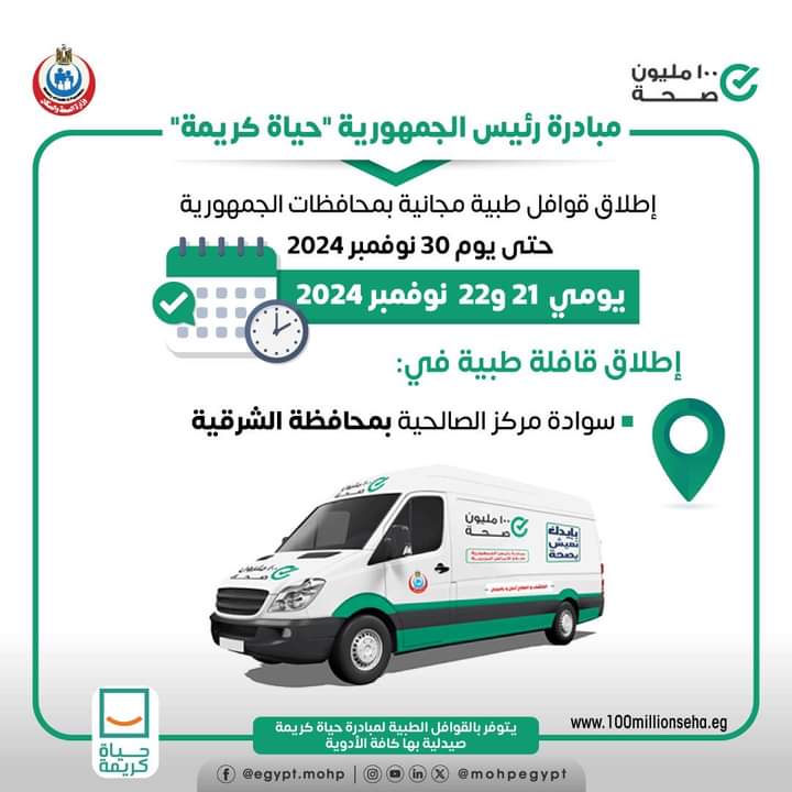 أعلنت وزارة الصحة إطلاق قافلة طبية ضمن مبادرة رئيس الجمهورية حياة كريمة يومي ٢١ و٢٢ نوفمبر للكشف والعلاج مجانًا في التخصصات الطبية نساء وولادة - خدمات تنظيم الأسرة - الأطفال والباطنة - الأنف والأذن والعظام - الجراحة - الرمد الأسنان - القلب - الجلدية وخدمات الأشعة والتحاليل.