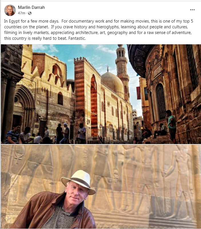 وقال صانع الأفلام الأمريكي مارلين دارا في رسالته التي وجهها للعالم عن مصر، عبر حسابه بالفيس بوك: "أزور مصر لبضعة أيام أخرى. من أجل العمل الوثائقي وصناعة الأفلام، تعد مصر واحدة من أفضل خمس دول على وجه الأرض".