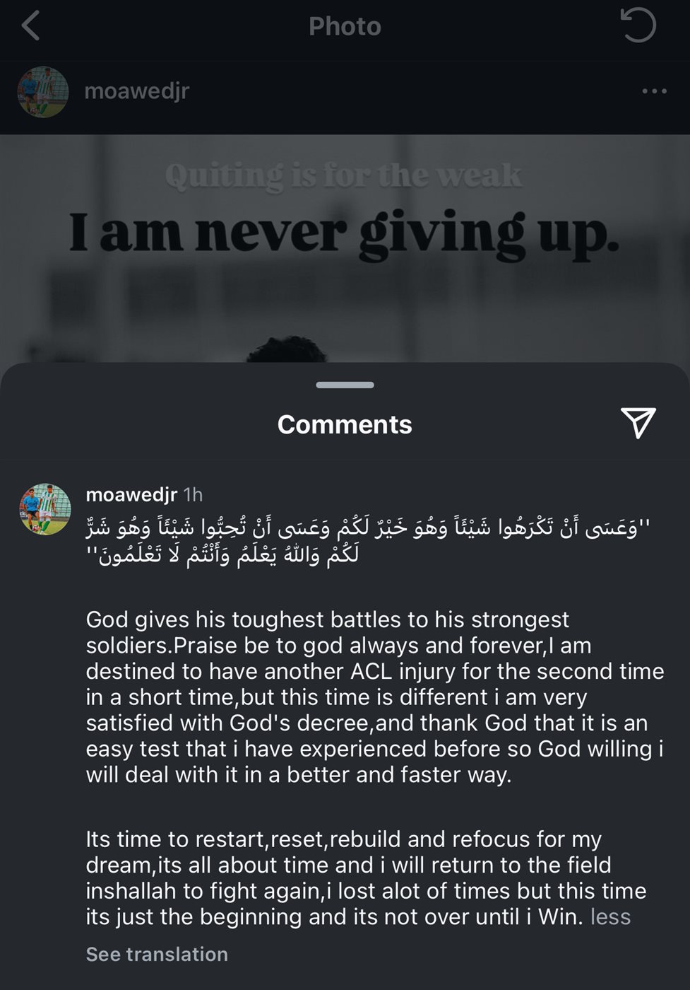 وتابع: "حان الوقت لإعادة البدء وإعادة الضبط وإعادة البناء وإعادة التركيز على حلمي، كل شيء يتعلق بالوقت وسأعود إلى الميدان إن شاء الله للقتال مرة أخرى، لقد خسرت الكثير في المرات السابقة لكن هذه المرة هي مجرد البداية ولن تنتهي حتى أفوز".