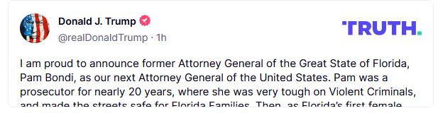 وكتب ترامب في منشور على موقع "تروث سوشيال" للتواصل الاجتماعي: "يسعدني أن أعلن تعيين بام بوندي، المدعية العامة السابقة لولاية فلوريدا العظيمة، كمدعية عامة جديدة للولايات المتحدة".