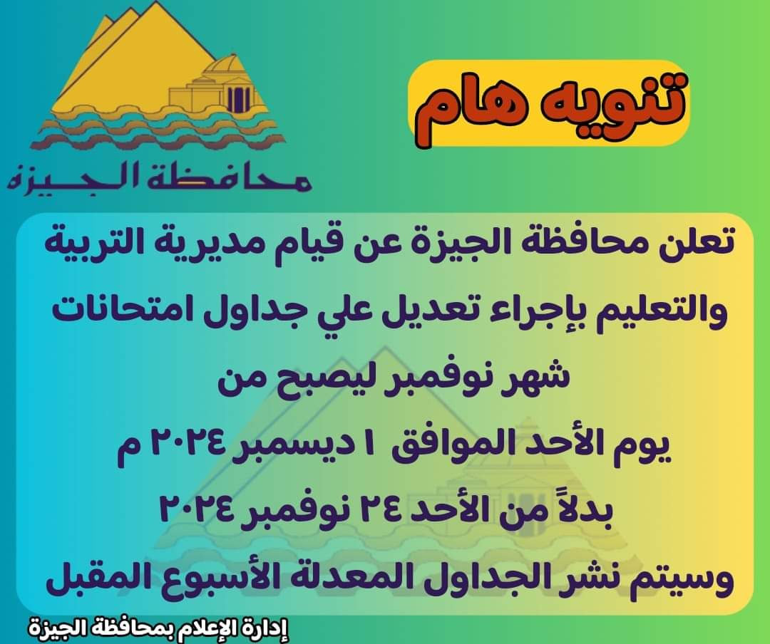 ودعت محافظة الجيزة جميع الطلاب والطالبات وأولياء الأمور إلى الانتباه إلى هذا التعديل ومتابعة نشر الجداول المعدلة خلال الأسبوع الجاري.
