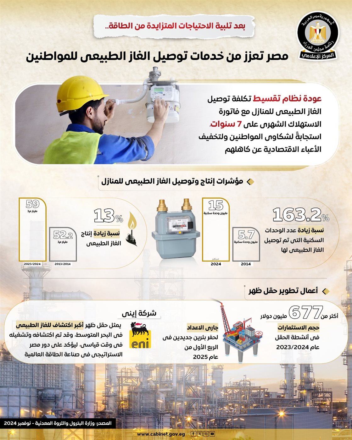 وفي هذا الصدد أصدر المركز الإعلامي لمجلس الوزراء تقريرًا تضمن إنفوجرافات تسلط الضوء على تعزيز مصر خدمات توصيل الغاز الطبيعي للمواطنين، بعد تلبية الاحتياجات المتزايدة من الطاقة.
