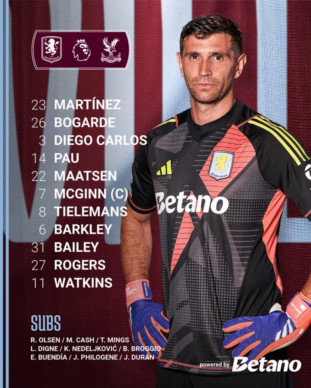 التشكيل الرسمي لمباراة أستون فيلا وكريستال بالاس في الدوري الإنجليزي