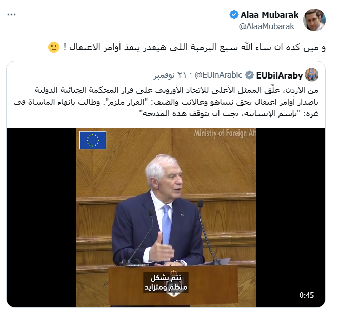 جاءت رسالة علاء مبارك تعليقًا على حديث الممثل الأعلى للإتحاد الأوروبي جوريف بوريل، على قرار المحكمة الجنائية الدولية، بإصدار أوامر اعتقال بحق نتنياهو وجالانت والضيف، قائلًا: "القرار ملزم"، وطالب بإنهاء المأساة في غزة قائلا "باسم الإنسانية، يجب أن تتوقف هذه المذبحة"