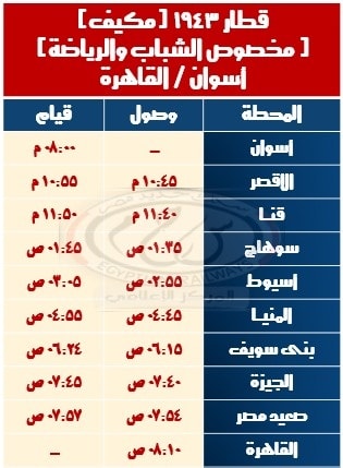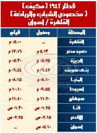 وجاء إعلان السكك الحديد فى إطار حرص الهيئة القومية لسكك حديد مصر على تقديم أفضل خدمة لجمهور الركاب، وتنفيذًا لتوجيهات المهندس محمد عامر – رئيس الهيئة تعلن الهيئة عن تشغيل خدمة جديدة بالوجه القبلى بعربات مكيفة فرنساوى مطور بين القاهرة / نجع حمادى والعكس.