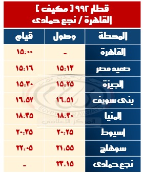 واعتبارًا من يوم الاثنين الموافق 25/ 11/ 2024 تشغيل قطار 993 سوهاج / القاهرة على ان يقوم من محطة نجع حمادى الساعة 02:05 ويصل محطة القاهرة الساعة 10:20 بنفس التركيب الوارد به قطار 992 لمحطة نجع حمادى طبقًا للجداول المرفقة.