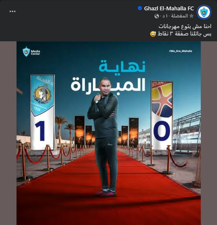 ونشرت صفحة المحلة الرسمية علي فيسبوك تعليق طريف عقب الفوز علي الجونة وكتبت “احنا مش بتوع مهرجانات، بس جاتلنا صفقة بـ٣ نقاط”.