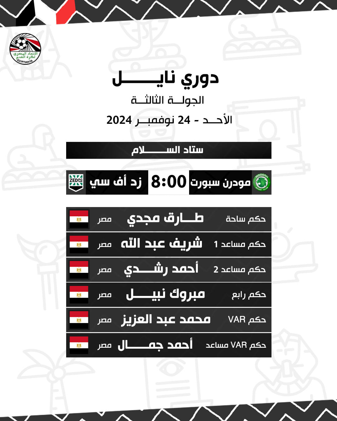 تنطلق مباراة مودرن سبورت ضد زد إف سي في الثامنة مساءا، ويستضيفها استاد السلام، ويديرها الحكم طارق مجدي