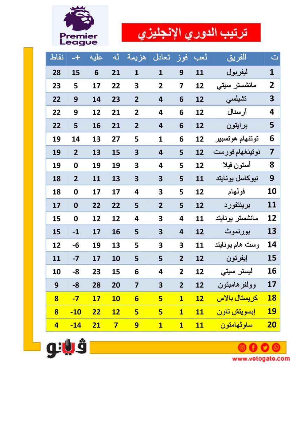 ترتيب الدوري الإنجليزي، يتصدر ليفربول بطولة الدوري الإنجليزي برصيد 28 نقطة، قبل مباراته اليوم أمام ساوثهامبتون في الجولة الـ 12 من البريميرليج.