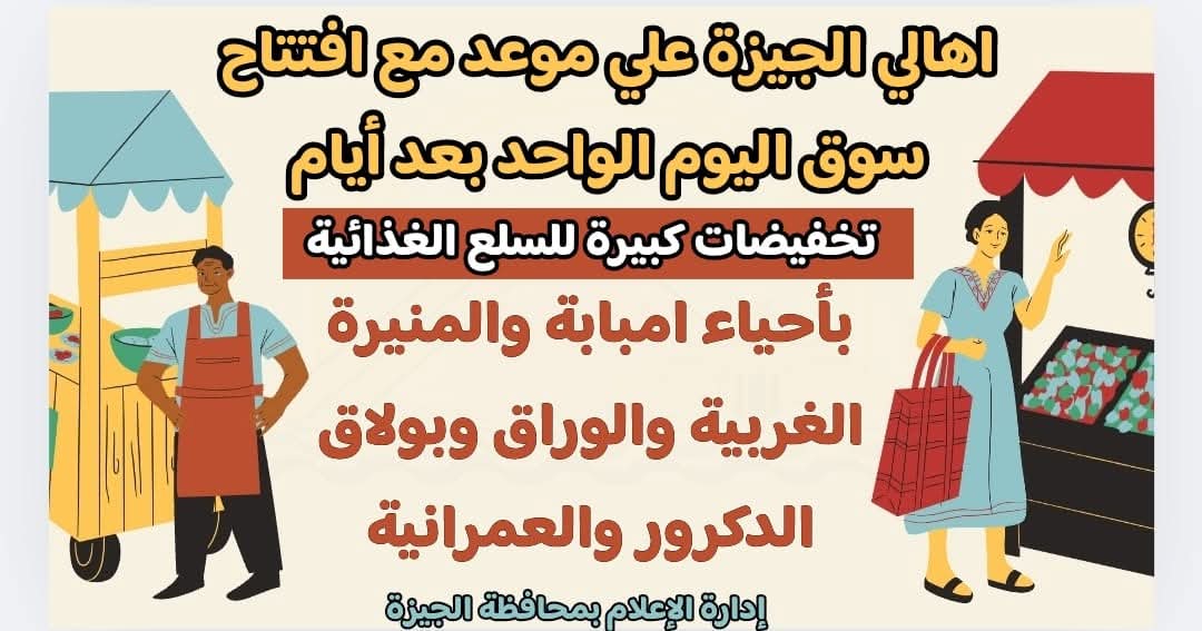 أعلنت محافظة الجيزة عن افتتاح أسواق اليوم الواحد خلال أيام في عدة مناطق بالمحافظة بأحياء امبابة والمنيرة الغربية وبولاق الدكرور والعمرانية، وذلك في إطار سعيها لتوفير السلع الأساسية للمواطنين بأسعار مخفضة وتخفيف الأعباء عن كاهلهم.