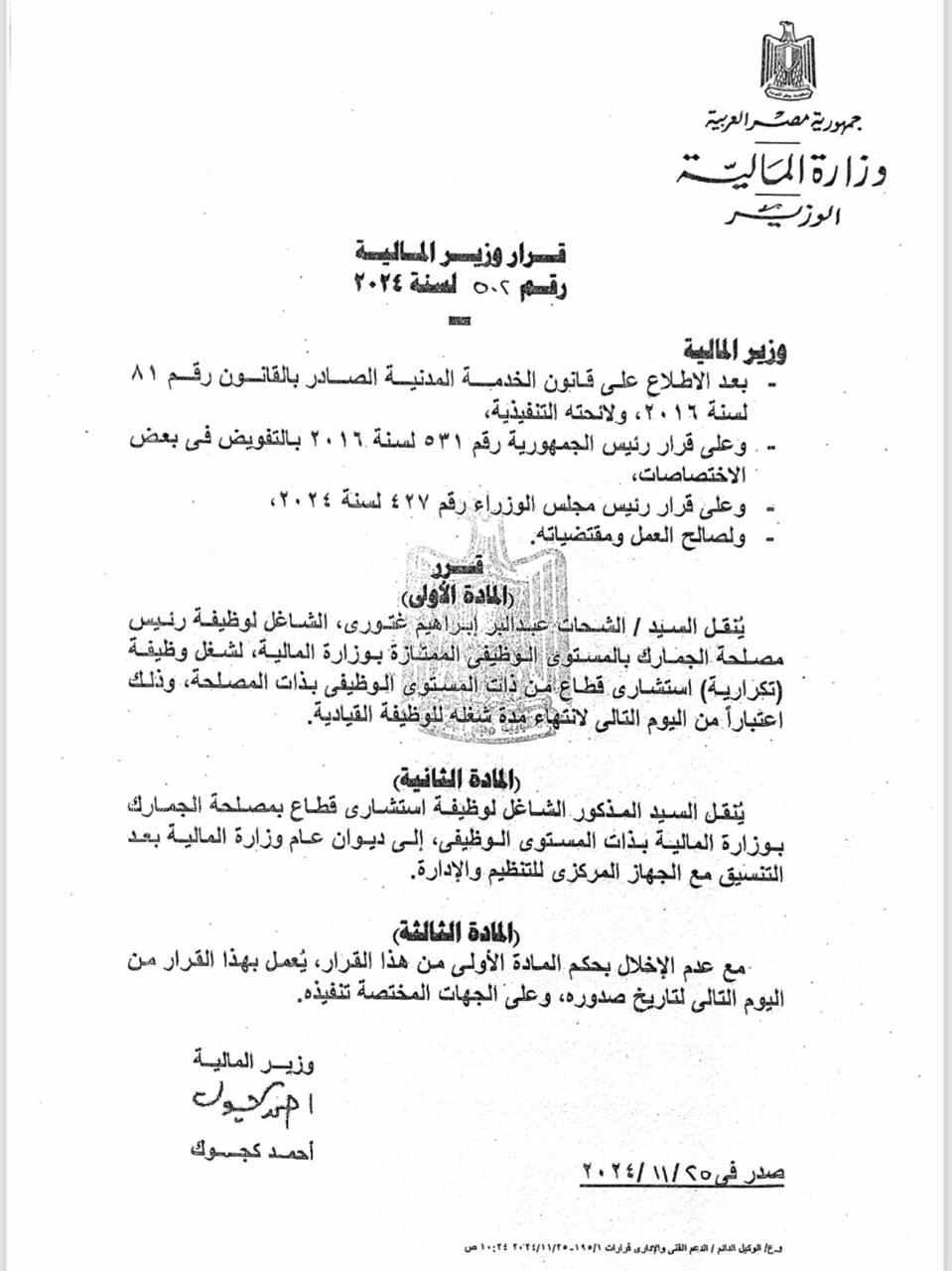 أصدر أحمد كجوك وزير المالية قرار رقم 502 الصادر في 25 نوفمبر لسنة 2024، بشأن نقل الشحات عبد البر إبراهيم غتوري، الشاغل لوظيفة رئيس مصلحة الجمارك بالمستوى الوظيفي الممتازة بوزارة المالية، لشغل وظيفة (تكرارية) استشاري قطاع من ذات المستوى الوظيفي بذات المصلحة، وذلك اعتبارًا من اليوم التالى لانتهاء مدة شغله للوظيفة القيادية.