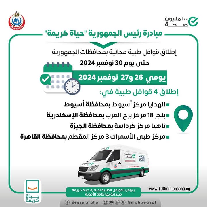 أعلنت وزارة الصحة إطلاق ٤ قوافل طبية ضمن مبادرة رئيس الجمهورية حياة كريمة يومي ٢٦ و٢٧ نوفمبر للكشف والعلاج مجانًا في التخصصات الطبية نساء وولادة - خدمات تنظيم الأسرة - الأطفال والباطنة - الأنف والأذن والعظام - الجراحة - الرمد الأسنان - القلب - الجلدية وخدمات الأشعة والتحاليل.