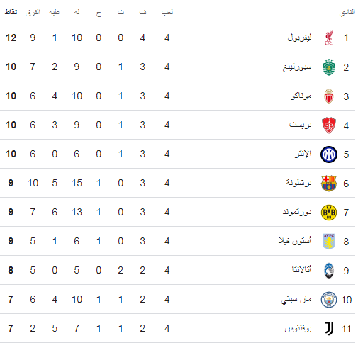 دوري أبطال أوروبا، يتصدر ليفربول جدول ترتيب دوري أبطال أوروبا موسم 2024-2025 قبل انطلاق مباريات الجولة الخامسة.