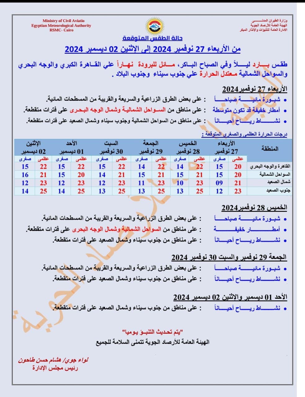 كما حذرت هيئة الأرصاد الجوية من نشاط رياح بسرعة 30 كم في الساعة، على مناطق من السواحل الشمالية والغربية وشمال الوجه البحري ووسط سيناء وجنوب سيناء وسلاسل جبال البحر الأحمر وشمال الصعيد.