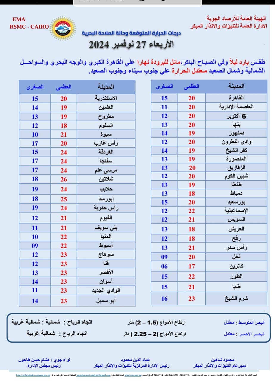 ونشرت هيئة الأرصاد الجوية بيانا بدرجات الحرارة المتوقعة اليوم على مدن ومحافظات مصر، وجاءت كالتالي: