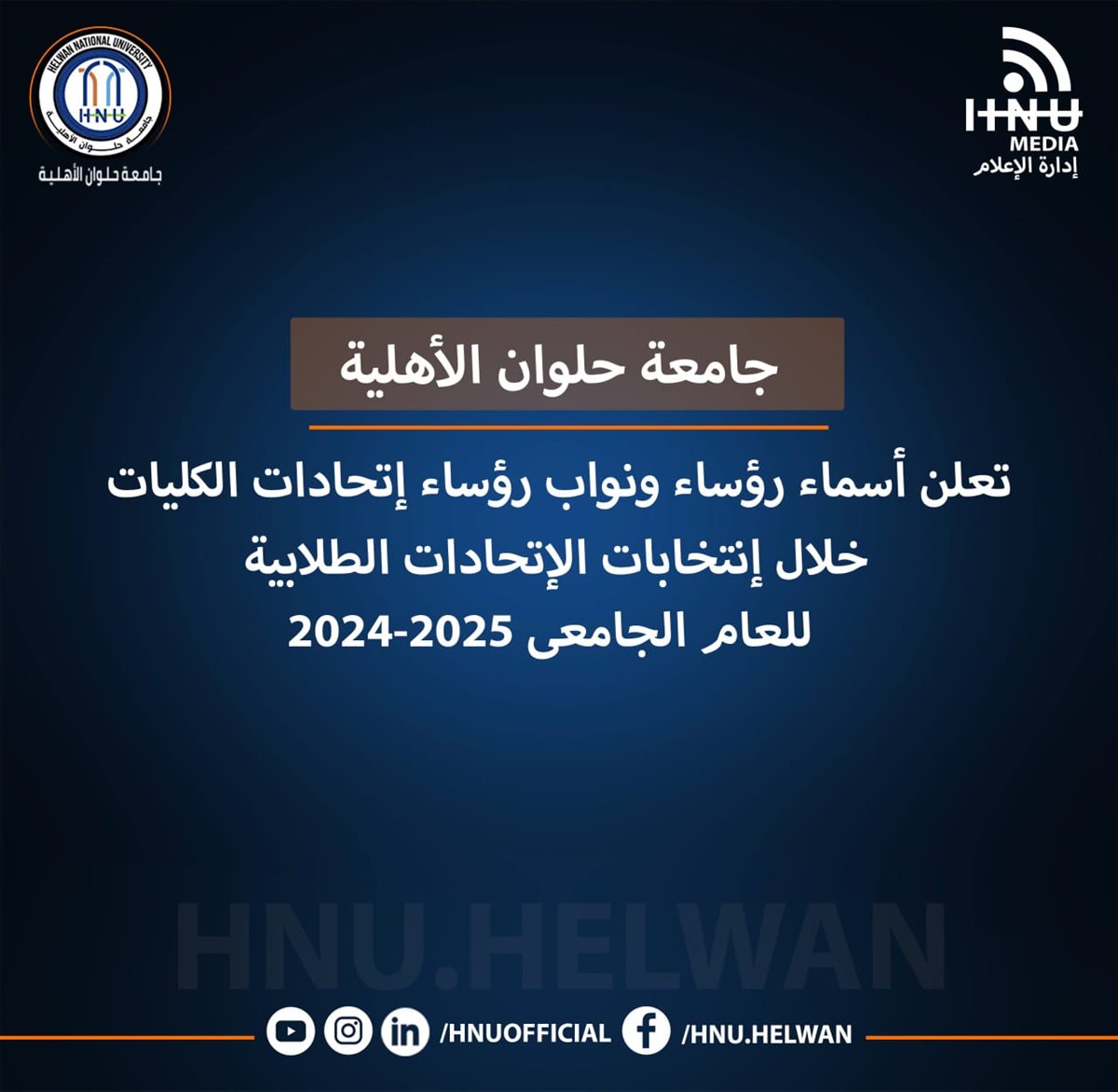 جامعة حلوان الأهلية تعلن أسماء رؤساء ونواب رؤساء اتحادات الكليات في انتخابات الاتحادات الطلابية