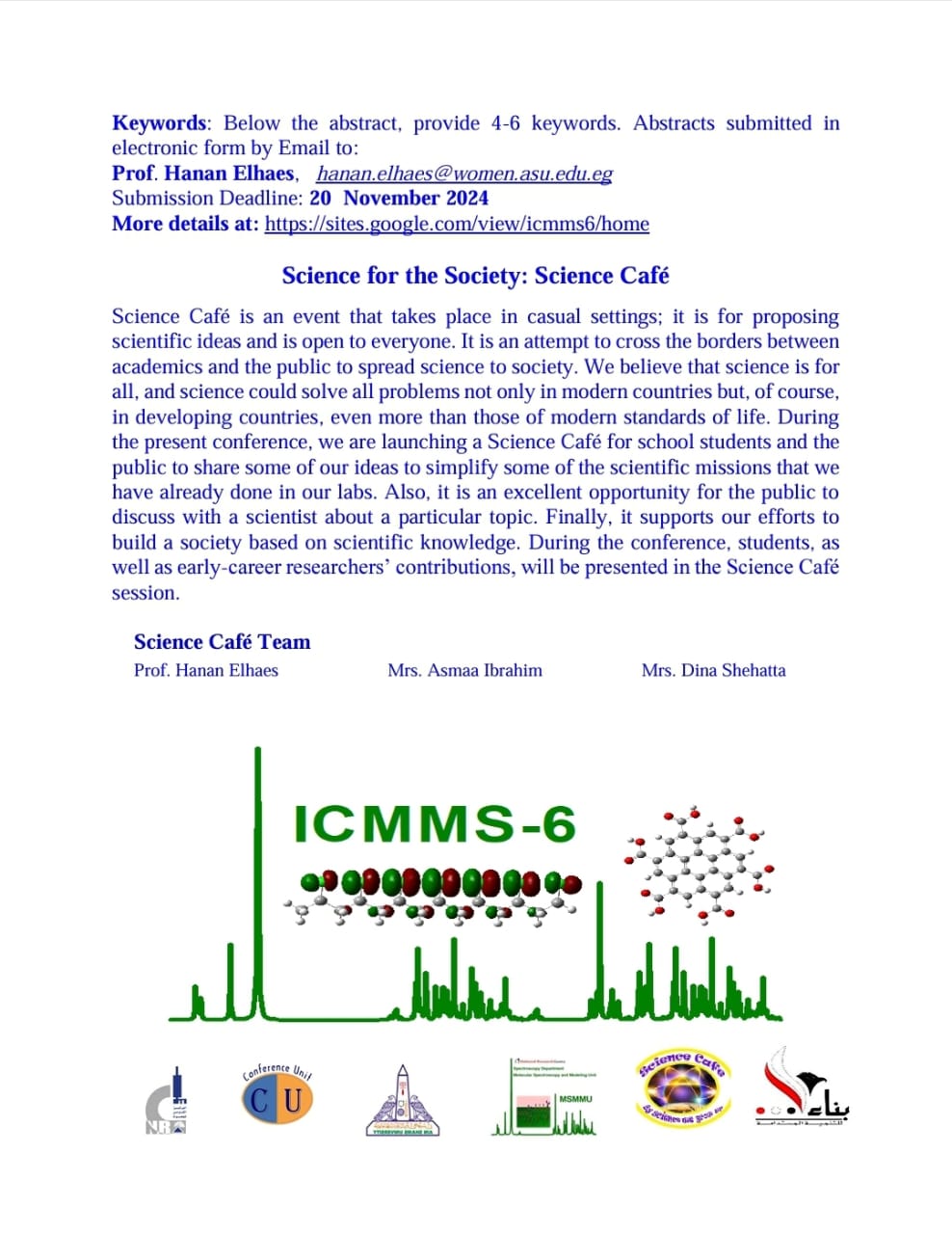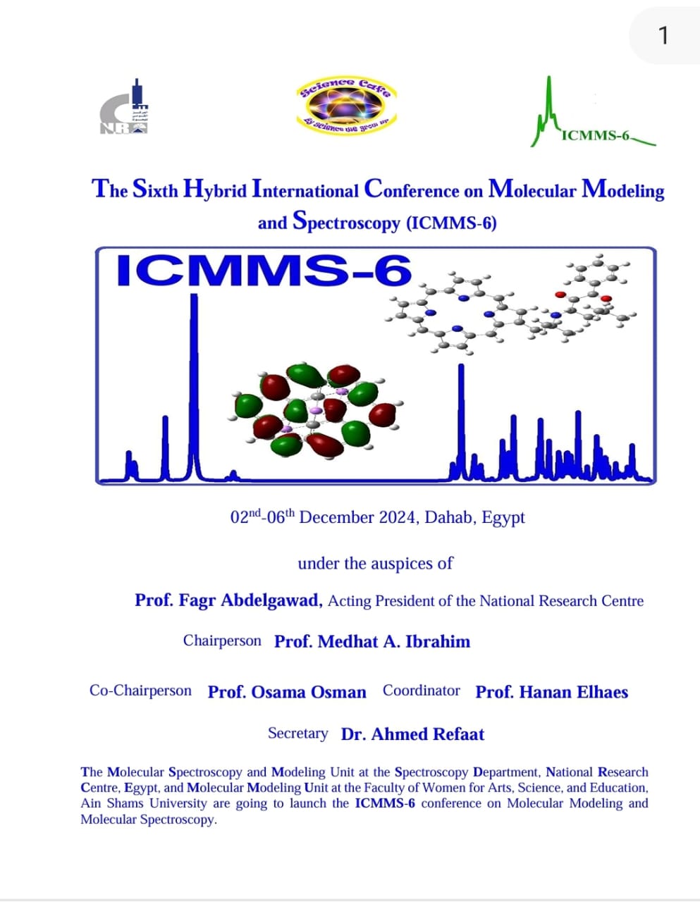 قررالمركز القومي للبحوث انطلاق فعاليات المؤتمر الدولى السادس للنمذجة الجزيئية والأطياف لهذا العام عن طريق المزج بين حضور الباحثين بمدينة دهب وأيضا بإستخدام تطبيق الزووم للمشاركة عن بعد، وذلك في رحاب مدينة دهب وبرعاية الدكتورة فجر عبد الجواد القائم بعمل رئيس المركز، وبرئاسة الدكتور مدحت إبراهيم عميد معهد البحوث الفيزيقية السابق