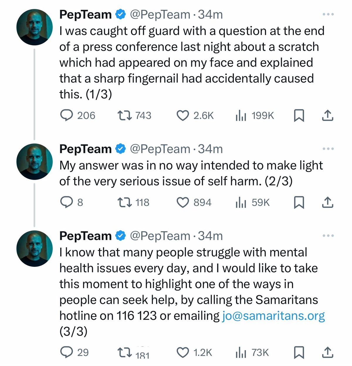 ورد بيب جوارديولا على تصريحاته التي أشعلت مواقع التواصل الاجتماعي عبر منصة اكس لأول حول تصريحه المثير أمس "ايذاء النفس".