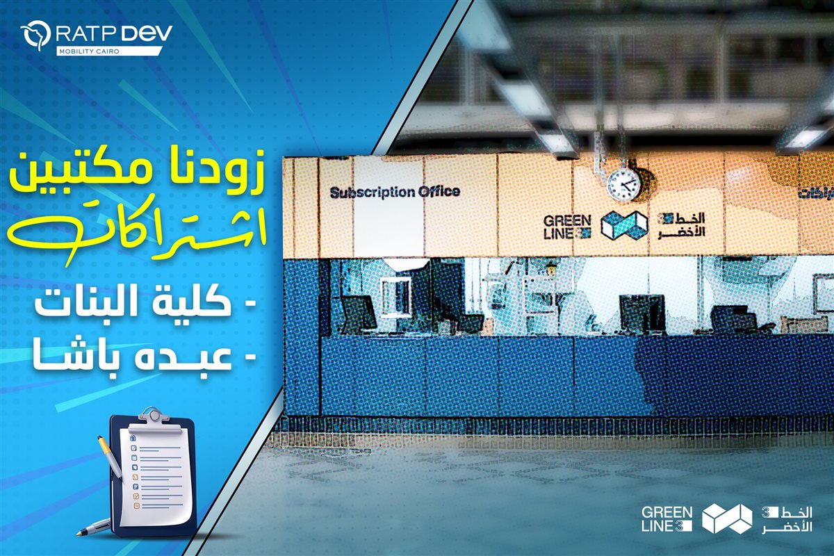 وقال مسؤول في مترو الخط الثالث إنه بداية من الأحد ١ ديسمبر فإن مكاتب الاشتراكات تزيد مكتبين. والمكاتب متاحة في محطات كلية البنات، عبده باشا، عدلي منصور، النزهة، هليوبوليس، العباسية، العتبة، ناصر، صفاء حجازي، إمبابة، القومية، وادي النيل، جامعة الدول وجامعة القاهرة.