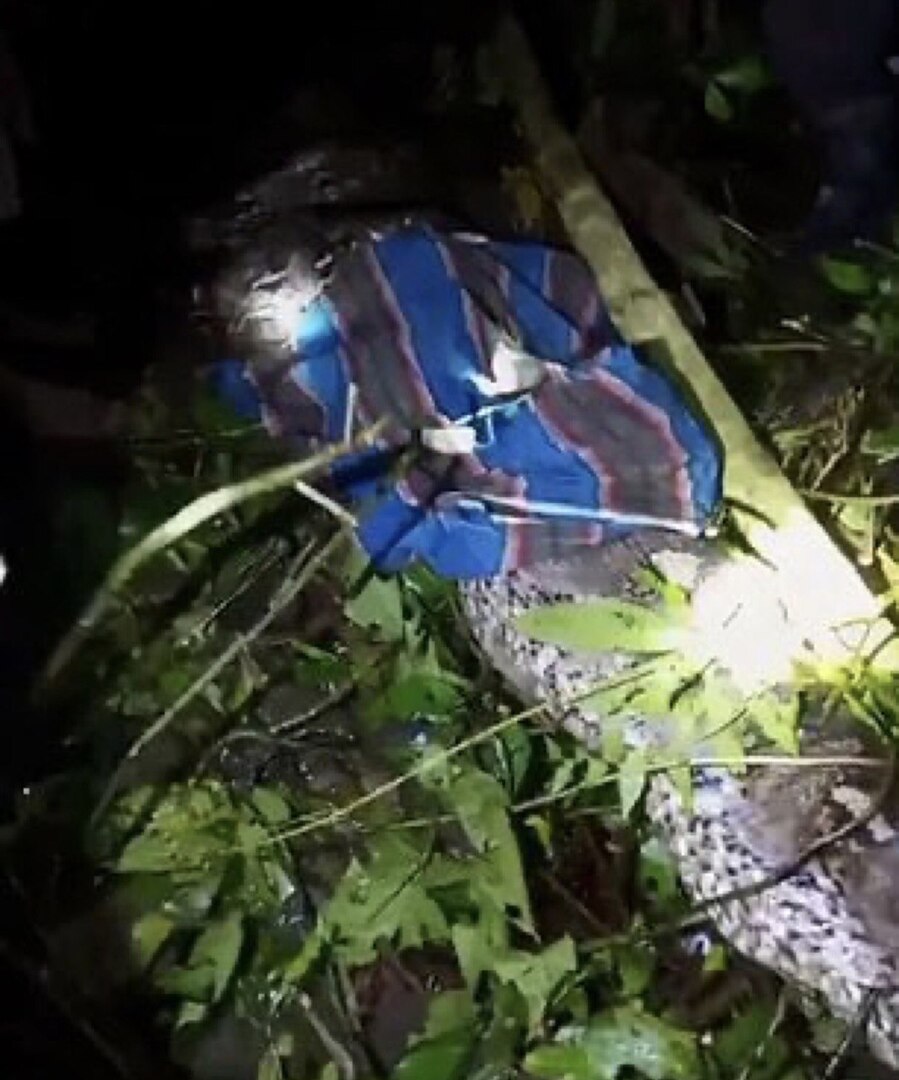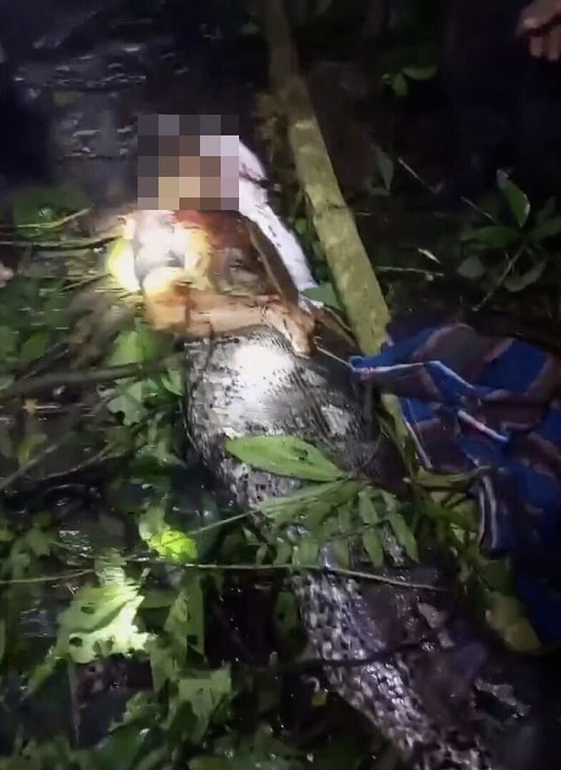 وأظهرت لقطات مصورة كيف وصلت شرطة القرية والعديد من أفرادها إلى مكان الحادثة وفتحوا جسد الثعبان ليكشفوا عن جثة عامل مزرعة النخيل المغطاة بالوحل قبل منتصف الليل بقليل.