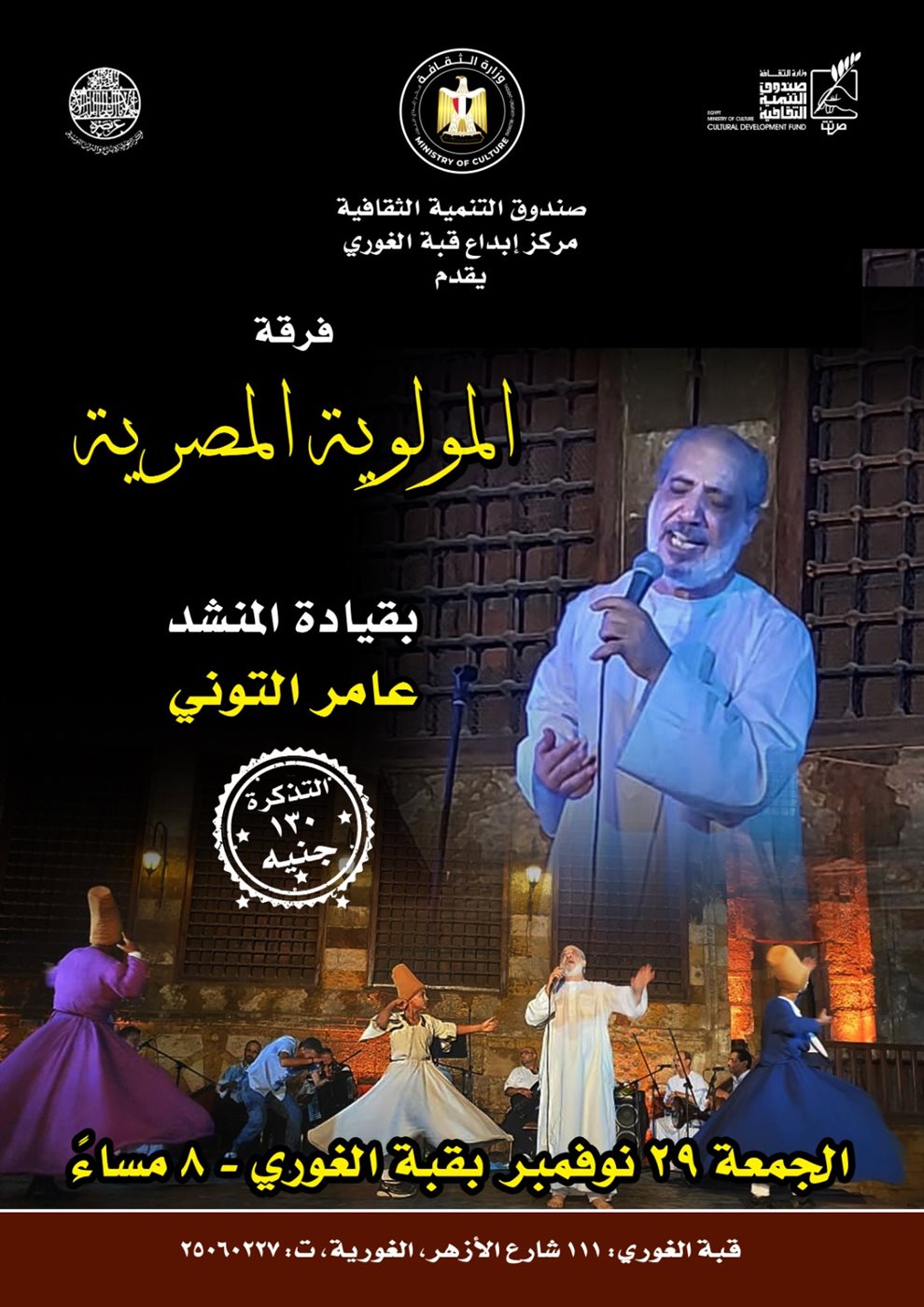 يقدم قطاع صندوق التنمية الثقافية برئاسة المعماري حمدي السطوحي، عرضًا جديدًا من عروض فرقة المولوية المصرية بمركز إبداع قبة الغوري بشارع الأزهر، في الثامنة مساء غد الجمعة الموافق 29 نوفمبر، بقيادة الفنان الدكتور عامر التوني.
