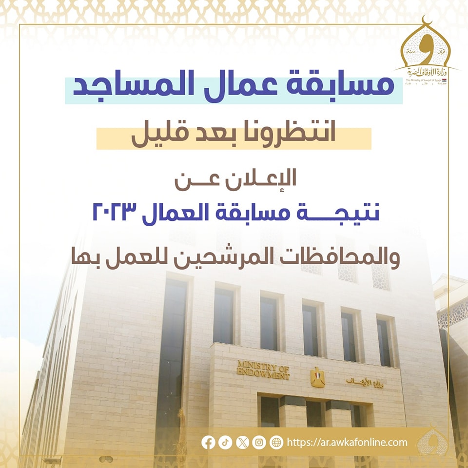 قالت وزارة الأوقاف إنه سيتم إعلان نتيجة مسابقة عمال المساجد 2023 بعد قليل، وذلك بأسماء الناجحين والمحافظات المرشحة للعمل فيها.
