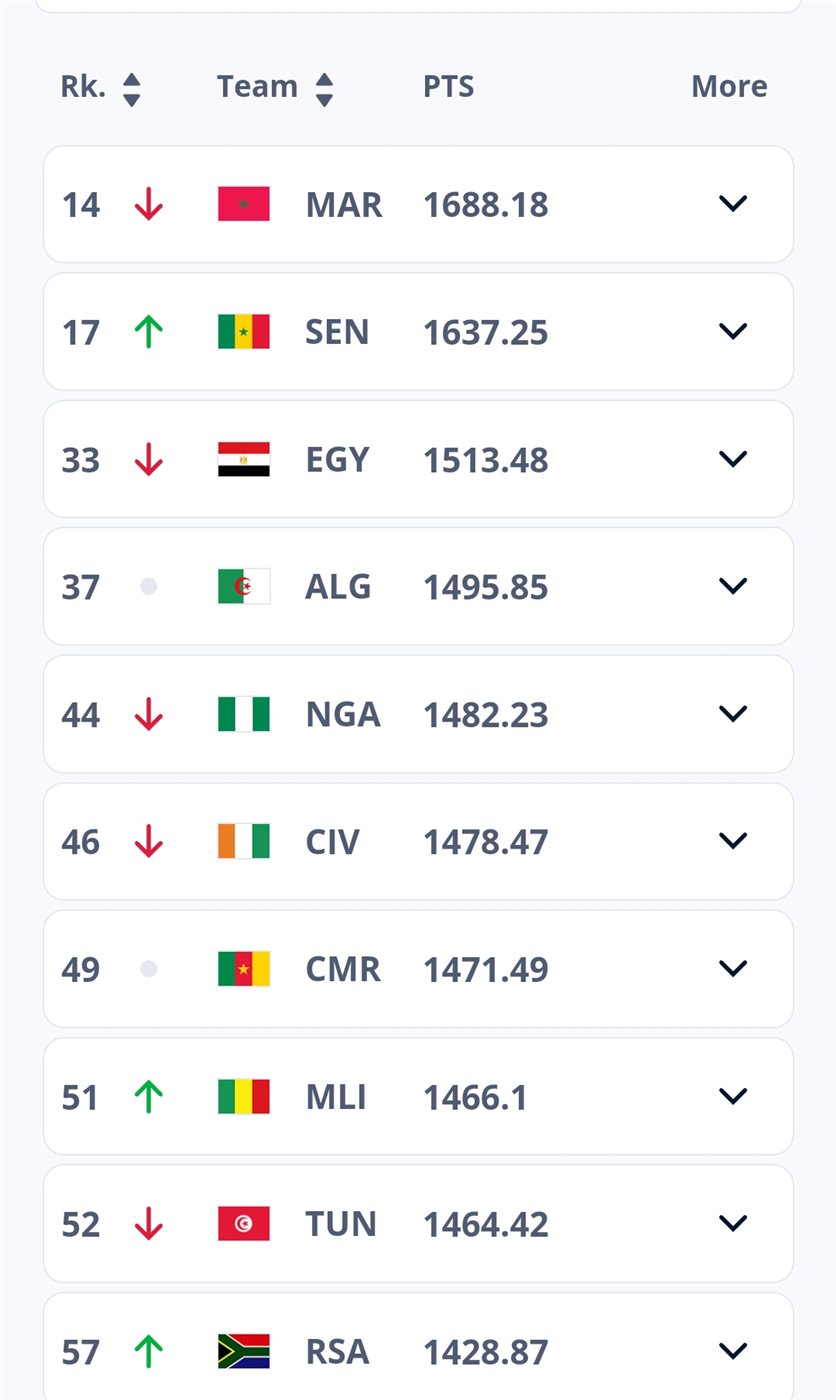 المغرب يتصدر، ترتيب أفضل 10 منتخبات أفريقية في تصنيف الفيفا