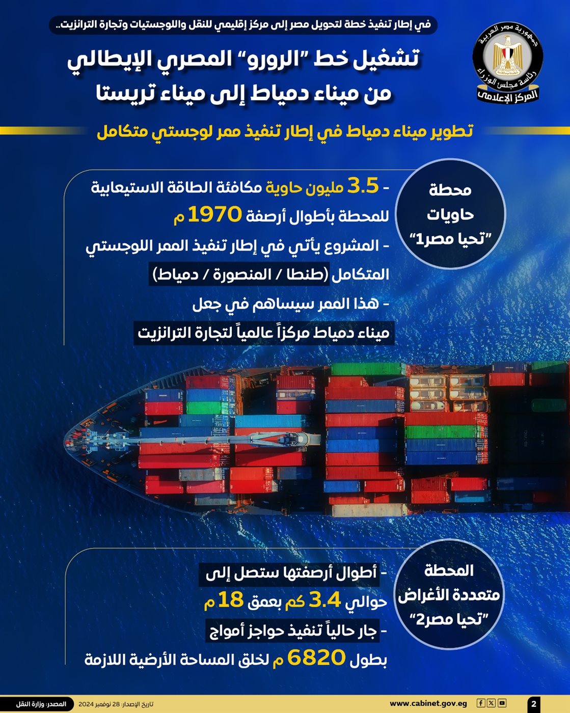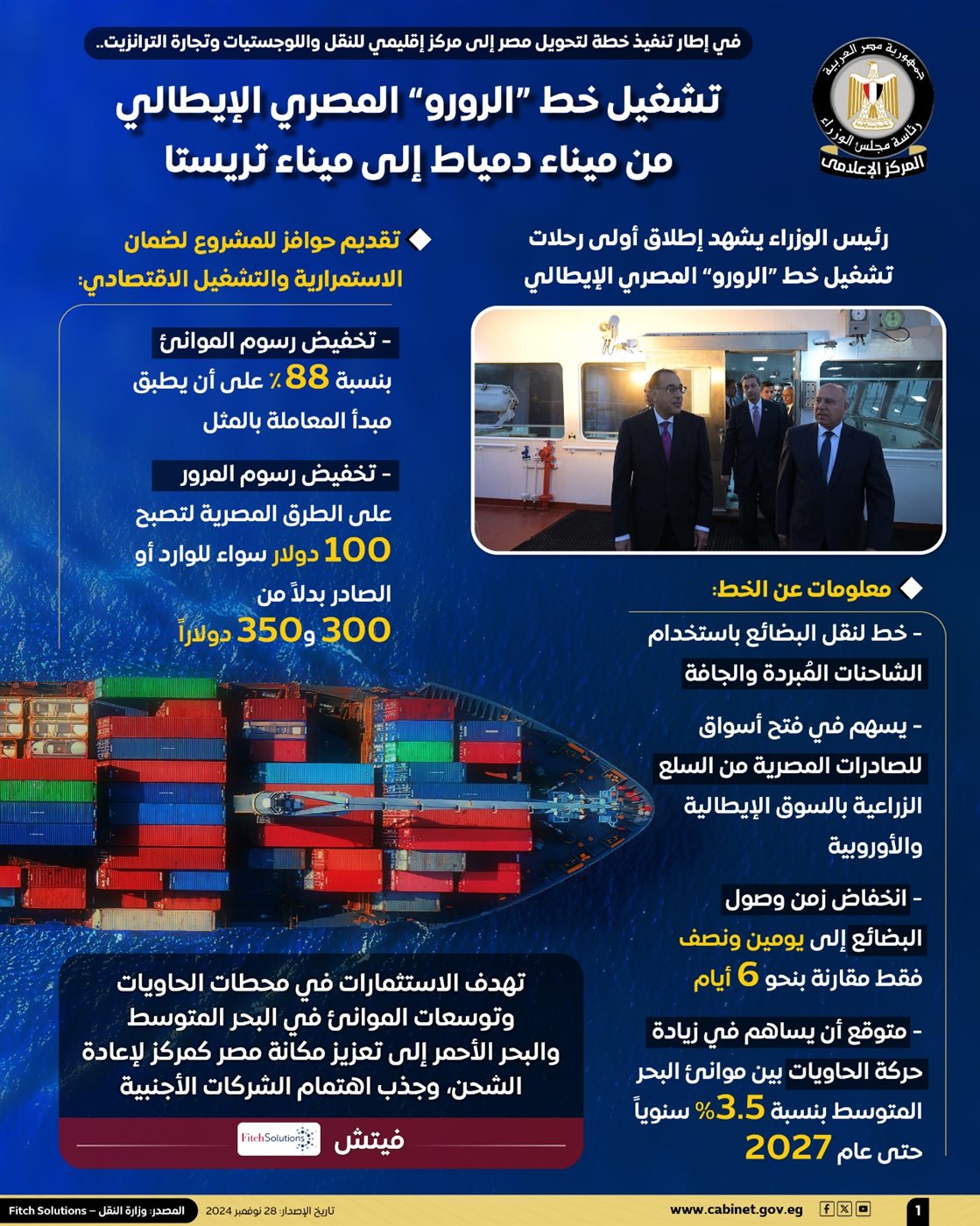 وفي هذا الصدد، نشر المركز الإعلامي لمجلس الوزراء تقريرًا تضمن إنفوجرافات تسلط الضوء على تشغيل خط "الرورو" المصري الإيطالي من ميناء دمياط إلى ميناء تريستا، في إطار تنفيذ خطة لتحويل مصر إلى مركز إقليمي للنقل واللوجستيات وتجارة الترانزيت.