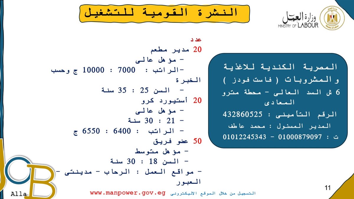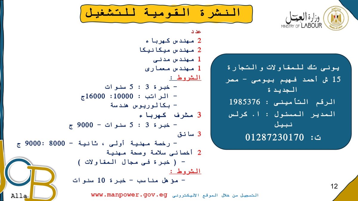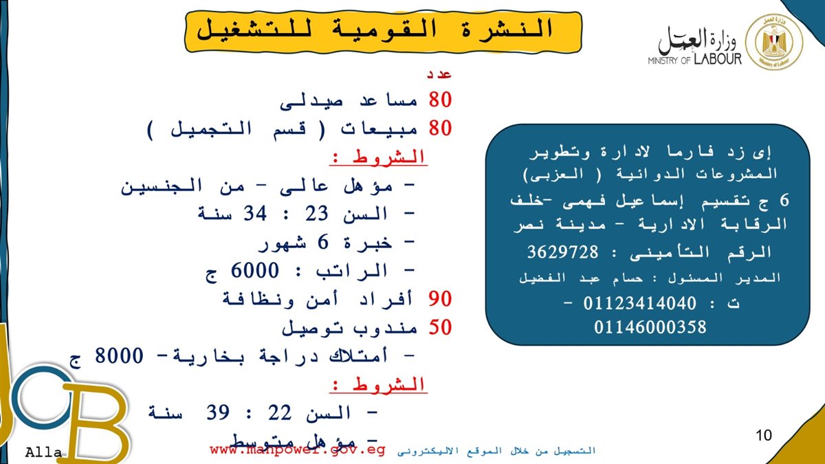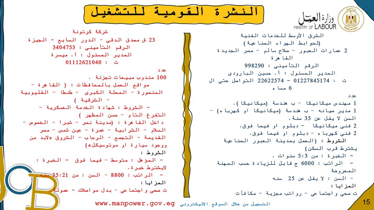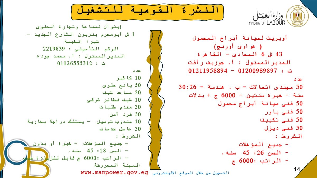 وبحسب البيان قالت "الوزارة" أن نشرة التوظيف الدورية تَصّدُر كل 15 يومًا، من خلال الإدارة العامة للتشغيل برئاسة هبه أحمد مدير عام التشغيل بالوزارة، وإعداد منى شوقي باحث أول بـ"الإدارة"، تُعلِن اليوم عن فُرص عمل جديدة،مُتوفرة في 10 محافظات، هي: القاهرة، والجيزة،والقليوبية، والشرقية، والمنوفية، والإسماعيلية، والمنيا، وجنوب سيناء، وأسوان، والغربية، وفي تخصصات: أخصائي تسويق، وأخصائي موارد بشرية، ومهندس اتصالات، ومهندسين كهرباء جميع التخصصات، ومشرفي ميكانيكا وتحكم كهرباء، ومدير صيانة، ومحاسبين، ومشرف تنجيد، وليدى جارد – إناث، ومشرف عام، ومشرف موقع، وشيف، وأخصائي مشتريات، وبائعين، ومقدم طلبات، وأخصائي تمويل، وأمين مخازن، ومهندسين ميكانيكا،وإنتاج وجودة، وأعمال إدارية، وسائقين رخصة أولى وثانية وثالثة، ومندوبين مبيعات، ومراقبين جودة، وفنيين جميع التخصصات، ومشرفي إنتاج، وأفراد أمن، ومهن الفندقة بكافة الأقسام،وعمال انتاج، وعمال نظافة، وتخصصات أخرى.