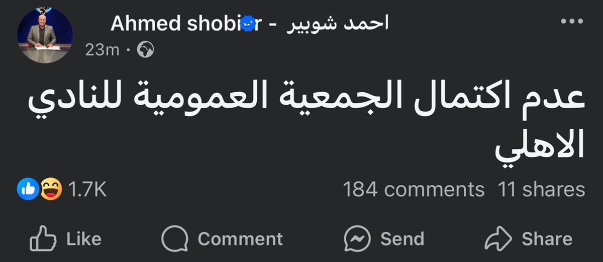 ونشر شوبير عبر صفحتة الرسمية علي موقع فيسبوك قائلا “ عدم اكتمال الجمعية العمومية للنادي الأهلي ".