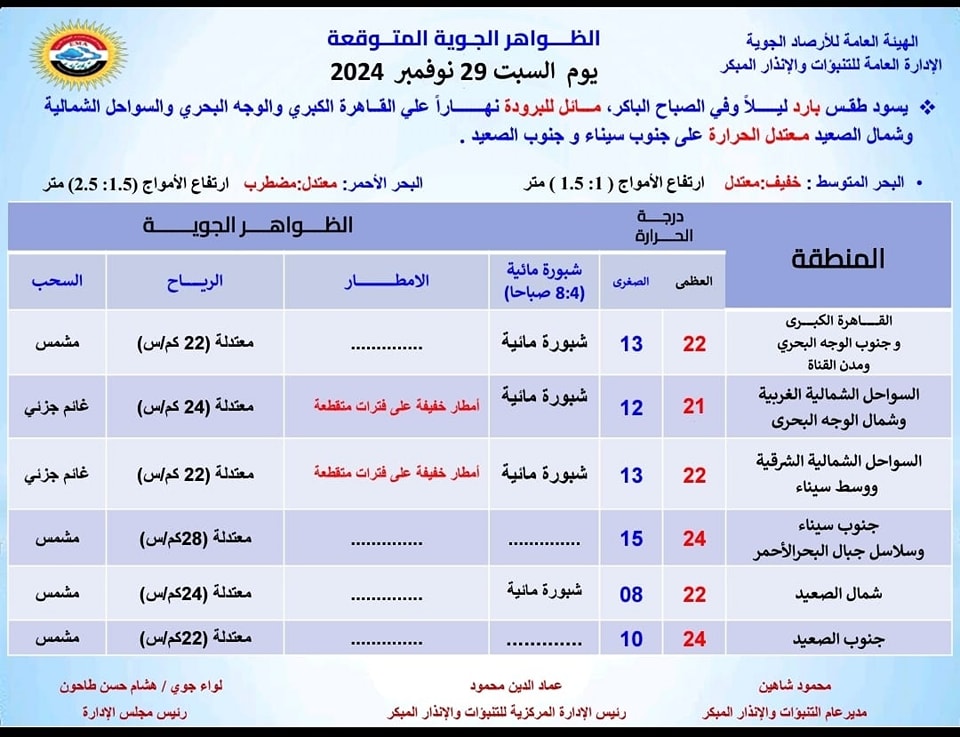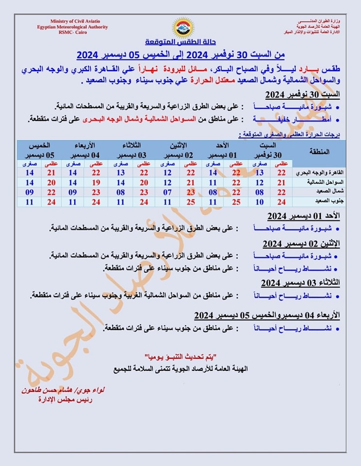 طقس اليوم، كشفت هيئة الأرصاد الجوية عن حالة الطقس اليوم السبت 30 - 11 - 2024، وأبرز الظواهر الجوية المتوقعة على محافظات مصر.