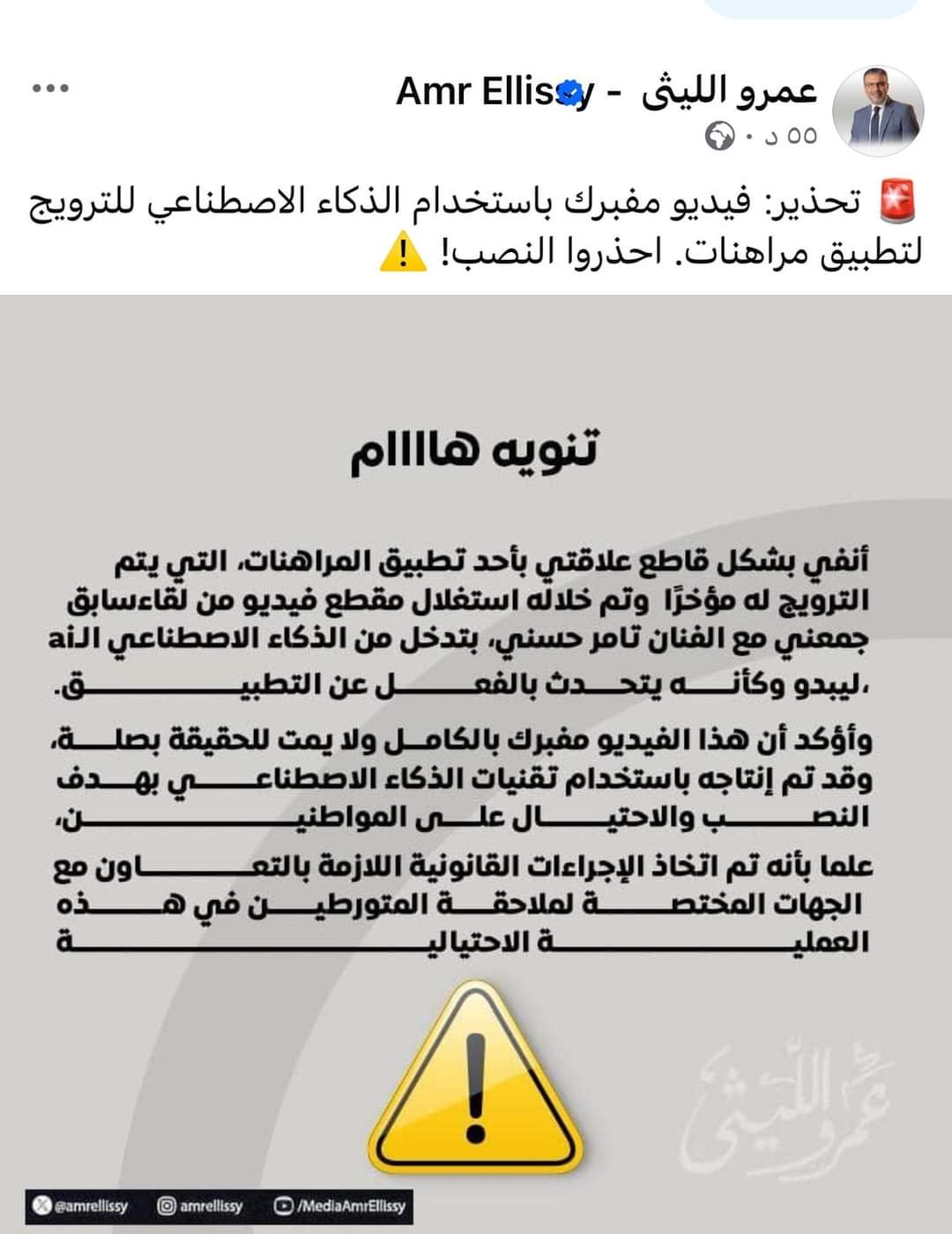 وأكد عمرو الليثي عبر صفحاته الرسمية عبر وسائل التواصل الاجتماعي، أن هذا الفيديو مفبرك بالكامل ولا يمت للحقيقة بصلة وقد تم إنتاجه باستخدام تقنيات الذكاء الاصطناعي بهدف النصب والاحتيال على المواطنين، علمًا بأنه تم اتخاذ الإجراءات القانونية اللازمة بالتعاون مع الجهات المختصة لملاحقة المتورطين في هذه العملية الاحتيالية